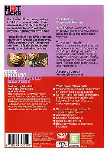 56 pages. Published by Hot Licks. Tuck Andress is a master of fingerstyle guitar who now shares his subtle skills and techniques with you. Tuck gives in-depth demonstrations and explanations about every aspect of fingerstyle, including walking bass patterns combined with chords, comping rhythms, voicings, vibrato, sliding, leading with the melody, various right- and left-hand techniques&and much more. A superb course in fingerstyle mastery! WITH A NEW INTRODUCTION BY WOODY MANN Jazz and blues guitarist Woody Mann learned from the legendary Rev. Gary Davis and then played and recorded with Son House, Bukka White and John Fahey. He has performed throughout the world, recorded over a dozen CDs, and is an internationally renowned guitar teacher. YOU'LL NEVER MISS A NOTE! -You see the music and the tablature on screen as it's being played! -All right and left hand techniques are shown in close up and with helpful split-screen effects to make learning easy -Slow motion segments with standard pitch sound -Artist biography -Selected discography -Suggested listening -Booklet with music examples included