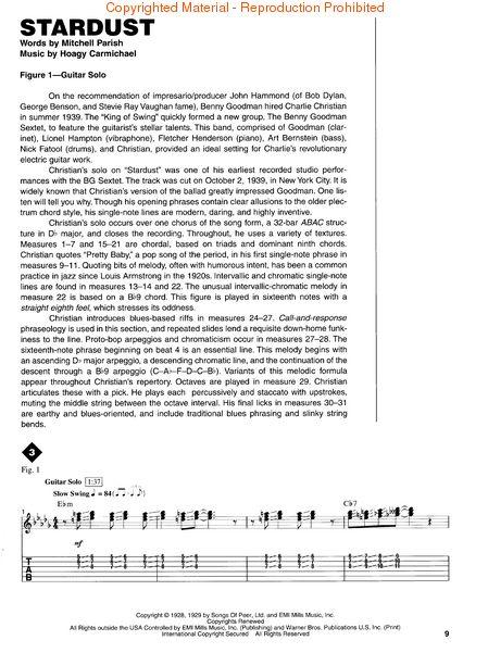 Explore the riffs, solos and sounds of the original electric jazz guitar virtuoso with this comprehensive book/CD pack! Wolf Marshall uses excerpts from 15 of Christian's classics to demonstrate his groundbreaking techniques, including: Air Mail Special -Benny's Bugle -Good Enough to Keep (Air Mail Special) -Grand Slam -Honeysuckle Rose -I've Found a New Baby (I Found a New Baby) -Seven Come Eleven -Shivers - Solo Flight -Stardust -Wholly Cats, and more. Includes an introduction and foreword, and a Charlie Christian biography and axology. 64 pages.