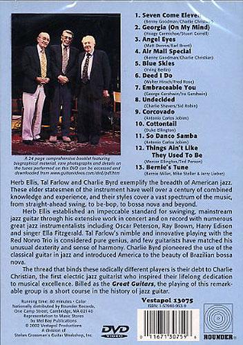 Herb Ellis, the late Tal Farlow, and Charlie Byrd exemplify the breadth of American jazz. These elder statesmen of the guitar shared well over a century of combined knowledge and experience with styles covering a vast spectrum of the music, from straight-ahead swing and be-bop to bossa nova and beyond. The thread that bound these radically different players was their debt to Charlie Christian, the first electric jazz guitarist and the common inspiration for their lifelong dedication to musical excellence. Billed as the Great Guitars, a performance by this remarkable group offered a crash course in the history of jazz guitar. Selection include: Seven Come Eleven; Angel Eyes; and many more.