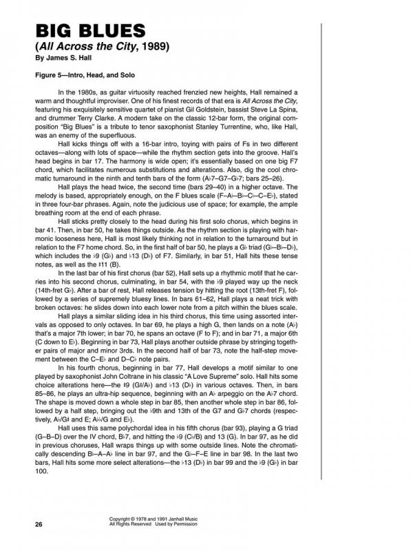 Around the same time, Hall moved to New York City, where through several intense collaborations, he was established as one of the world's most sophisticated jazz guitarists. From 1961 to 1962, he was a member of the tenor saxophonist Sonny Rollins's great quartet, with which he recorded the seminal album The Bridge. In the '60s Hall coled a quartet with trumpeter Art Farmer; he also recorded with the quartet of alto saxophonist Paul Desmond and found ideal duet partners in pianist Bill Evans and bassist Ron Carter. With Evans, Hall recorded two albums, Undercurrent (1962) and Intermodulation (1966), two of the most intimate and beautiful recordings in all of jazz. (From Intermodulation, see the transcription of "My Man's Gone Now," on page 34.) It was while performing in these fertile contexts that Hall found his own voice, an understated modern style characterized by melodic finesse, harmonic sophistication, and structural awareness-a logical extension of the language developed by such jazz-guitar pioneers as Charlie Christian, Wes Montgomery, and Django Reinhardt. This approach has been of profound influence to countless modern guitarists, including Hall's student Bill Frisell, who sounds radically different than Hall, but has a strikingly similar guitar conception. Hall's approach is best witnessed on the excellent albums he has recorded under his own name, including Concierto (1975), Jim Hall Live! (1976), and All Across the City (1989), transcriptions from all of which can be found on the following pages.