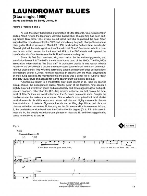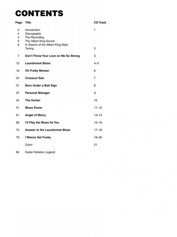 Learn the trademark riffs and solos of this blues King! Provides in-depth analysis of 12 songs: Angel of Mercy • Answer to the Laundromat Blues • Blues Power • Born Under a Bad Sign • Crosscut Saw • Don't Throw Your Love on Me So Strong • The Hunter • I Wanna Get Funky • I'll Play the Blues for You • Laundromat Blues • Oh Pretty Woman • Personal Manager. CD features full demonstrations.
