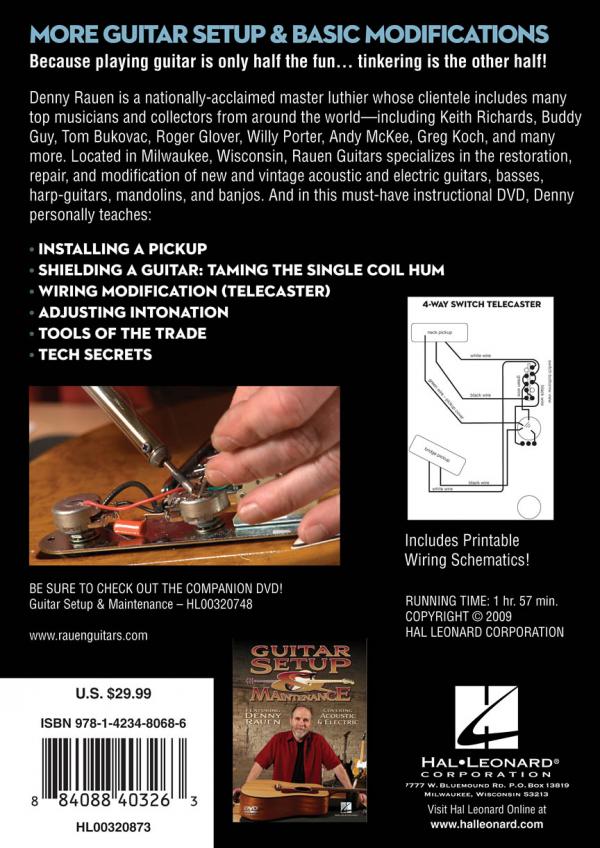 Denny Rauen is a nationally acclaimed master luthier whose clients include many top musicians and collectors from around the world - Keith Richards, Buddy Guy, Leo Kottke, Roger Glover and many others. In this must-have instructional DVD, Denny personally teaches: installing a pickup; shielding a guitar (taming the single coil hum); wiring modification (Telecaster); adjusting the truss rod; adjusting intonation; tools of the trade; tech secrets; and more. Includes printable wiring schematics! 1 hr. 57 min.