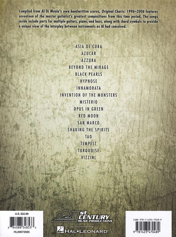 Compiled from Al Di Meola's own handwritten scores, Original Charts: 1996-2006 features 17 of the master guitarist's greatest compositions from this time period. The songs include parts for multiple guitars, piano, and bass, along with chord symbols to provide a unique view into the relationship of the individual instruments as Al had conceived. Pieces include: Azucar • Hypnose • Invention of the Monsters • Misterio • Opus in Green • Red Moon • San Marco • Tao • Turquoise • and more.