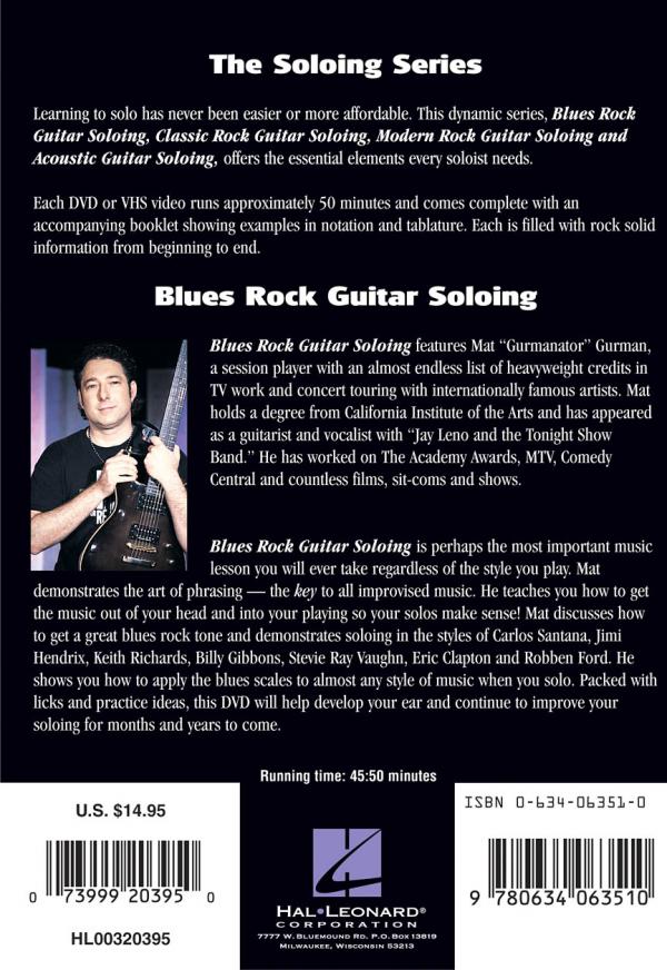 This DVD features top-rated session player Mat Gurman teaching one of the most important music lessons you will ever take, regardless of the style you play. Mat demonstrates the art of phrasing the key to all improvised music. He teaches how to get the music out of your head and into your playing, so your solos make sense. He tells how to get a great blues rock tone and demonstrates soloing in the styles of Carlos Santana, Jimi Hendrix, Keith Richards, Billy Gibbons, Stevie Ray Vaughan, Eric Clapton and Robben Ford. He also shows how to apply the blues scale to almost any style of music when you solo. Packed with licks and practice ideas, this DVD will help you develop your ear and continue to improve your soloing for months and years to come. Includes a lesson booklet showing examples in notation and TABLATURE . 46 minutes.