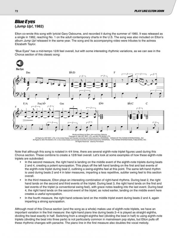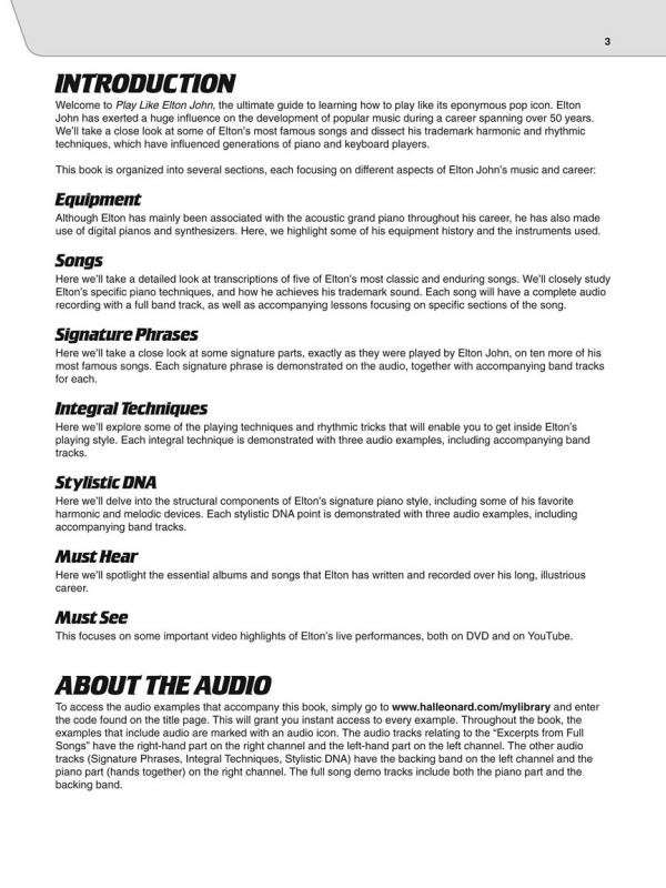 Study the trademark songs and signature phrases of the Rocket Man himself! This comprehensive book and audio teaching method provides detailed analysis of Elton John's grand pianos, techniques, styles, licks and much more. You'll learn everything you need to know about Elton's legnendary piano playing and find lists of recommended recordings and DVDs. It includes excerpts from 10 songs, plus five full songs: Don't Let the Sun Go Down on Me • Rocket Man • Crocodile Rock • Your Song • Sorry Seems to Be the Hardest Word.