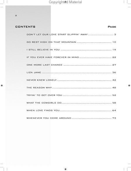 Songs include: I Still Believe in You * If You Ever Have Forever in Mind * Liza Jane * Never Knew Lonely * Tryin' to Get Over You * What the Cowgirls Do * Don’t Let Our Love Start Slippin' Away * Whenever You Come Around * Go Rest High on That Mountain * One More Last Chance * When Love Finds You * The Reason Why.
