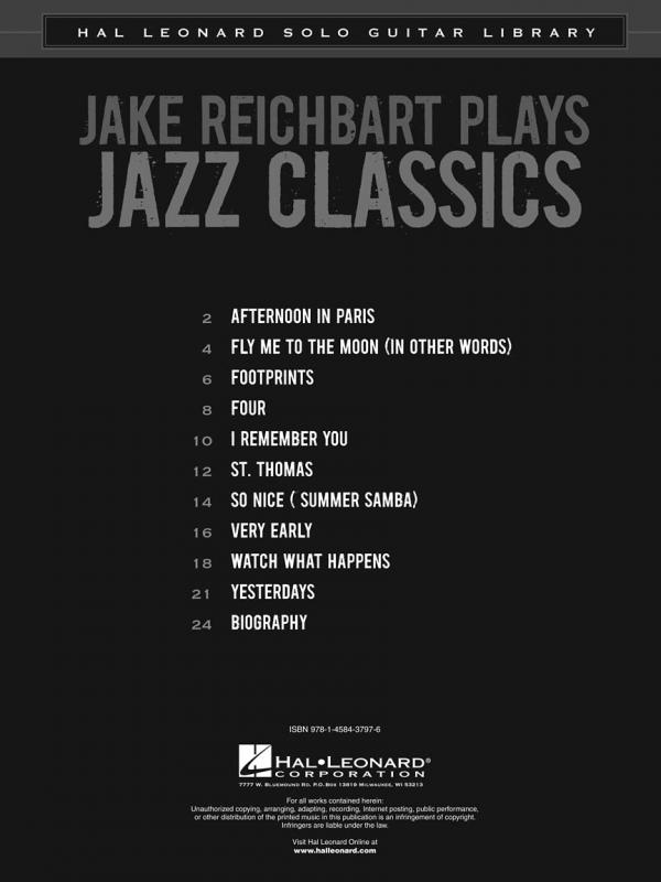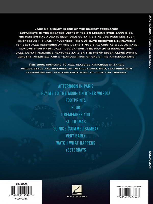 Ten stylish chord-melody arrangements in standard notation and tablature by Jake Reichbart, one of the busiest freelance guitarists in the business. This unique package also includes an instructional DVD, featuring him performing and teaching each song, to guide you through. Songs: Afternoon in Paris - Fly Me to the Moon (In Other Words) - Footprints - Four - I Remember You - St. Thomas - So Nice (Summer Samba) - Very Early - Watch What Happens - Yesterdays.