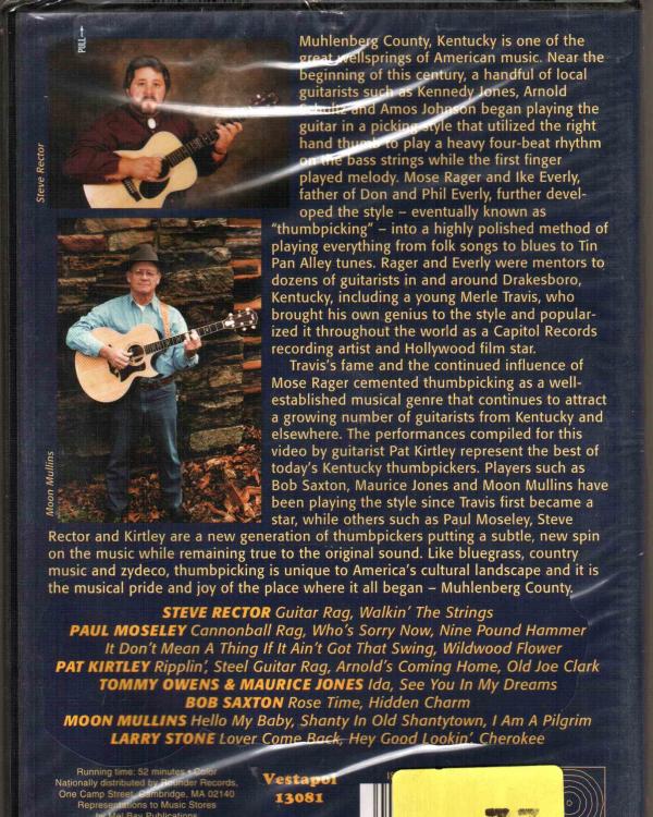 Featuring: Steve Rector, Paul Moseley, Pat Kirtley, Tommy Owens, Maurice Jones, Bob Saxton, Moon Mullins and Larry Stone Muhlenberg County, Kentucky is one of the great wellsprings of American music. Near the beginning of this century, a handful of local guitarists such as Kennedy Jones, Arnold Schultz and Amos Johnson began playing the guitar in a picking style that utilized the right hand thumb to play a heavy four-beat rhythm on the bass strings while the first finger played melody. Mose Rager and Ike Everly, father of Don and Phil Everly, further developed the style - eventually known as "thumbpicking" - into a highly polished method of playing everything from folk songs to blues to Tin Pan Alley tunes. Rager and Everly were mentors to dozens of guitarists in and around Drakesboro, Kentucky, including a young Merle Travis, who brought his own genius to the style and popularized it throughout the world as a Capitol Records recording artist and Hollywood film star.