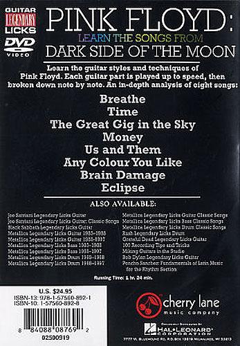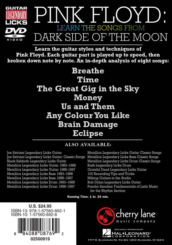 A must-have DVD for every Floyd fan, this DVD examines the licks from eight songs on their classic CD. Each guitar part is played up to speed, then broken down note by note. Analyzes: Any Colour You Like - Brain Damage - Breathe - Eclipse - The Great Gig in the Sky - Money - Time - Us and Them.