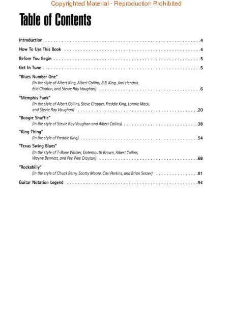 Learn lead guitar in the styles of Albert Collins, Eric Clapton, Albert King, B.B. King, Freddie King, Stevie Ray Vaughan and T-Bone Walker! This unique book/CD pack examines the solo concepts of each of these masters. The CD features full demos and rhythm-only tracks, and the book includes phrase-by-phrase performance notes and tips on bending strings, vibrato, tone, note selection and much more. Includes notes and tablature. A must for any blues guitarist! 96 pages.