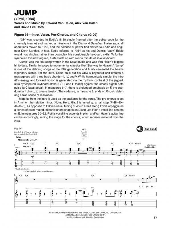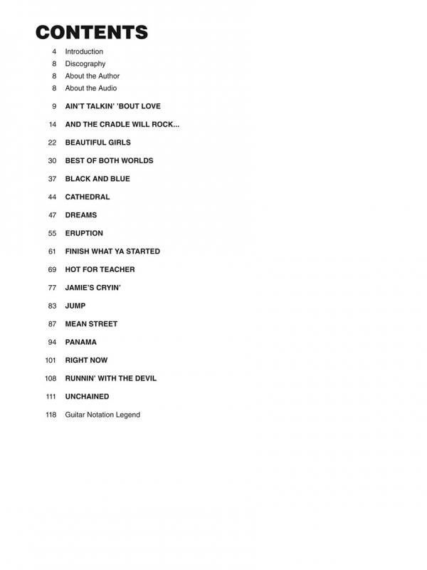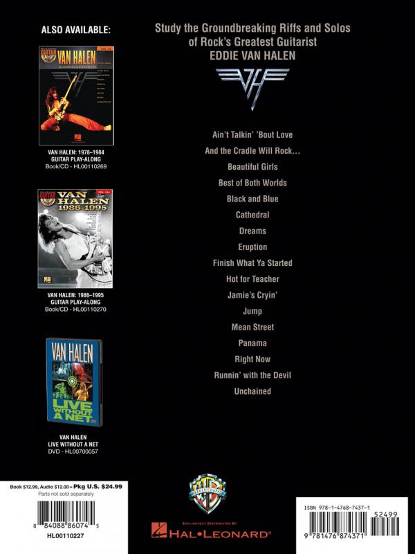 Learn the exact styles and techniques Eddie Van Halen used on 17 Van Halen classics with step-by-step breakdowns by Joe Charupakorn. Songs include: Ain't Talkin' 'Bout Love • And the Cradle Will Rock... • Beautiful Girls • Best of Both Worlds • Black and Blue • Cathedral • Dreams • Eruption • Finish What Ya Started • Hot for Teacher • Jamie's Cryin' • Jump • Mean Street • Panama • Right Now • Runnin' with the Devil • Unchained. Includes online access to full band audio demos at normal and slow speeds for download or streaming.