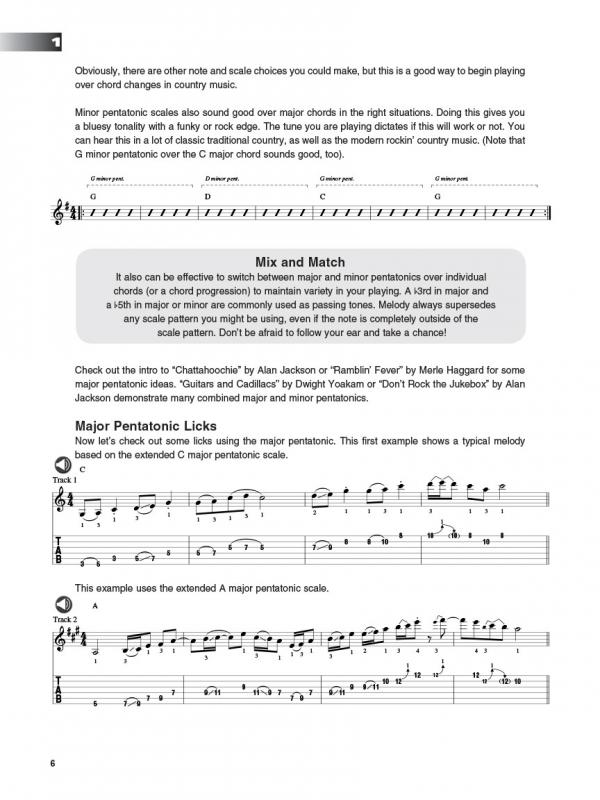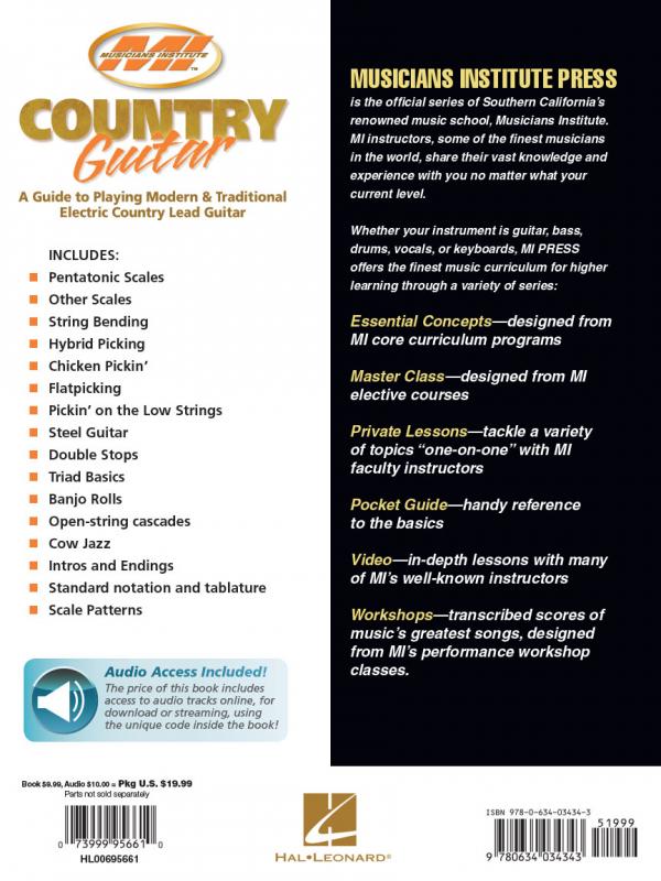 This guide to playing modern and traditional electric country lead guitar includes access to audio demo tracks online for download or streaming. Topics covered include: pentatonic and other scales • string bending • hybrid picking • chicken pickin' • flatpicking • pickin' on the low strings • steel guitar • double stops • triad basics • banjo rolls • open-string cascades • cow jazz • intros and endings. Includes standard notation and tablature.