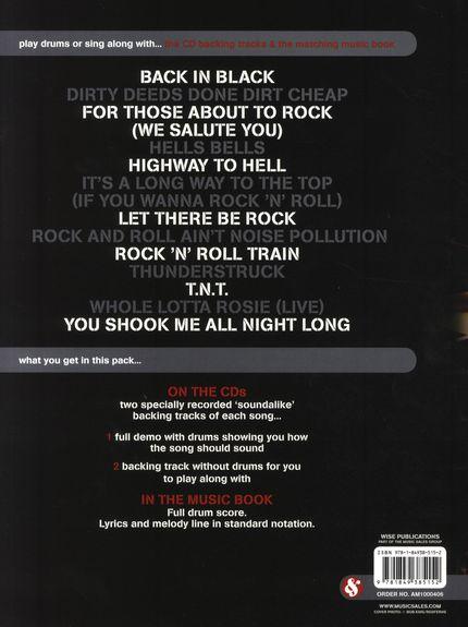 The book features authentic arrangements of songs such as Back In Black and You Shook Me All Night Long with full Drum score as well as lyrics and the melody line in standard notation. In addition to backing tracks to all the songs, the CDs also feature full performance tracks so you can hear what it's supposed to sound like before you play it yourself.