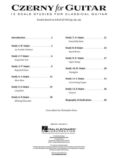 Adapted from Carl Czerny's School of Velocity, Op. 299 for piano, this lesson book explores 12 keys with 12 different approaches or “treatments.” You will explore a variety of articulations, ranges and technical perspectives as you learn each key. These arrangements will not only improve your ability to play scales fluently, but will also develop your ears, knowledge of the fingerboard, reading abilities, strength and endurance. In standard notation and tablature.