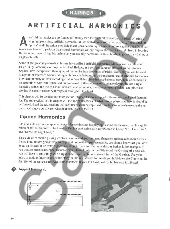 This in-depth look at guitar harmonics teaches the techniques of masters such as Lenny Breau, Eddie Van Halen, Billy Gibbons, Andrés Segovia and others! This book/CD pack covers: natural harmonics; tapped, plucked and pinch-style artificial harmonics; chordal and melodic applications for harmonics; and more. Includes a natural harmonic fretboard map and tuning tips. The CD contains demos of every example in the book. 48 pages.
