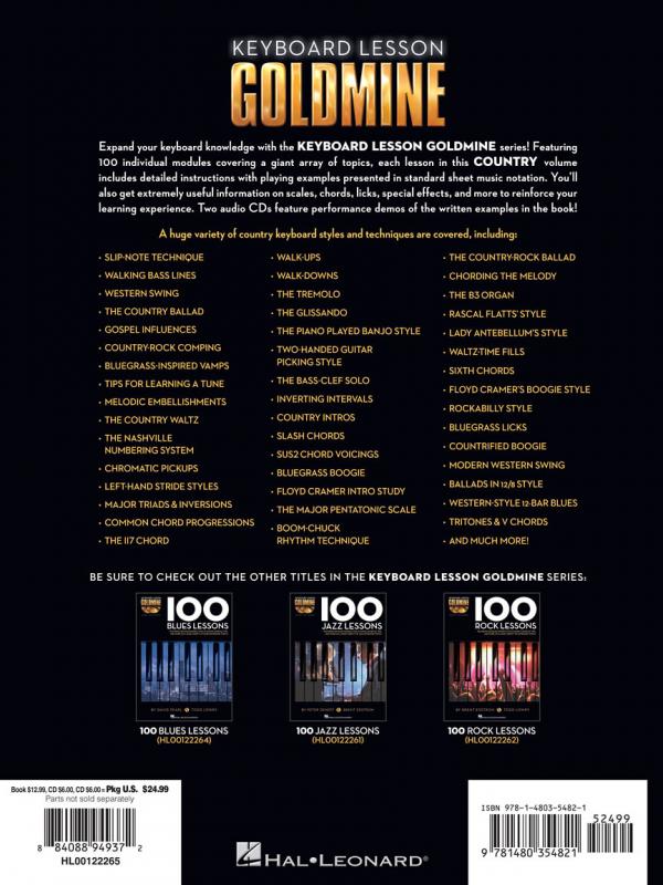 Expand your keyboard knowledge with the Keyboard Lesson Goldmine series! The series contains four books: Blues, Country, Jazz, and Rock. Each volume features 100 individual modules that cover a giant array of topics. Each lesson includes detailed instructions with playing examples. You'll also get extremely useful tips and more to reinforce your learning experience, plus two audio CDs featuring performance demos of all the examples in the book!