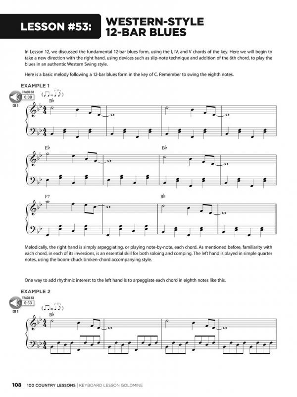 100 Country Lessons includes the Floyd Cramer Slip-Note Technique; left-hand comping styles; special techniques; blues scales, pentatonic scales, et. al.; the country ballad; and much more!