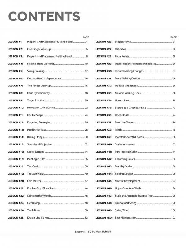 A huge variety of jazz bass styles, techniques, and concepts are covered, including: lessons for upright and electric bass; warm-ups; string crossing; fretting hand independence; hand synchronicity; sound and projection; tenths; jazz waltz; pedal points; interval cycles; beat manipulation; various scales; tritone substitution; using a bow; and much more!