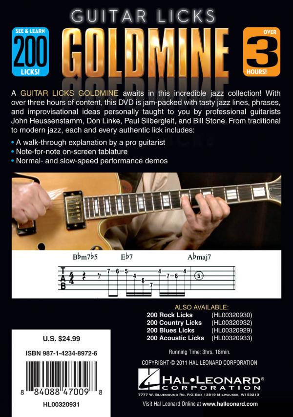 A Guitar Licks Goldmine awaits in this incredible jazz collection! This DVD is jam-packed with tasty jazz lines, phrases, and improvisational ideas personally taught to you by professional guitarists John Heussenstamm, Don Linke, Paul Silbergleit, and Bill Stone. From traditional to modern jazz, each and every authentic lick includes: a walk-through explanation by a pro guitarist; note-for-note on-screen tablature; normal and slow-speed performance demos. 3 hours, 18 minutes.