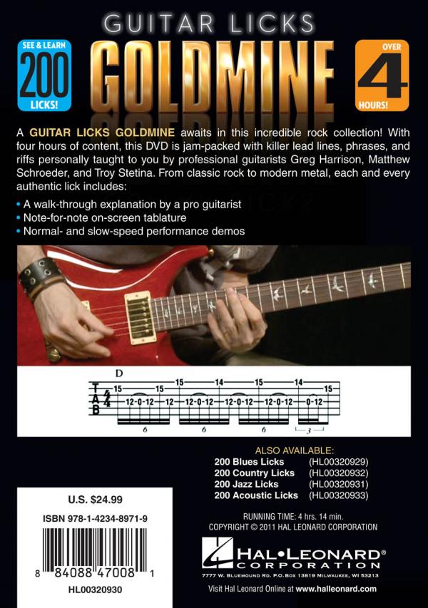 A Guitar Licks Goldmine awaits in this incredible rock collection! This DVD is jam-packed with killer lead lines, phrases, and riffs personally taught to you by professional guitarists Greg Harrison, Matthew Schroeder, and Troy Stetina. From classic rock to modern metal, each and every authentic lick includes: a walk-through explanation by a pro guitarist; note-for-note on-screen tablature; normal and slow-speed performance demos. 4 hours, 14 minutes.