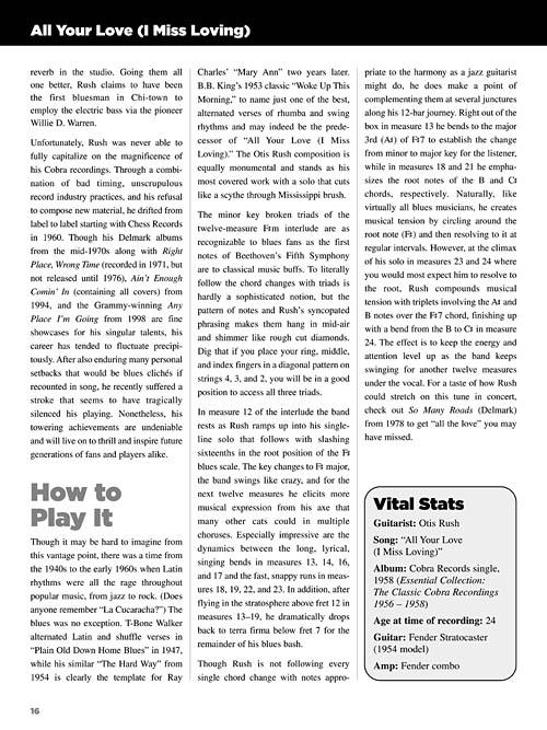 From Magic Sam and the Three Kings to Eric Clapton and the Vaughan brothers, take an inside look at the genesis of blues guitar. This book and CD compendium provides solo transcriptions in standard notation and tablature, lessons on how to play them, guitarist biographies, equipment, photos, history, and much more. The accompanying CD contains full-band demonstrations of every guitar solo in the book. For PC and Mac users, the CD is enhanced with Amazing Slow Downer software so you can adjust the recording to any tempo without changing pitch! 124 pages. Songs include:
