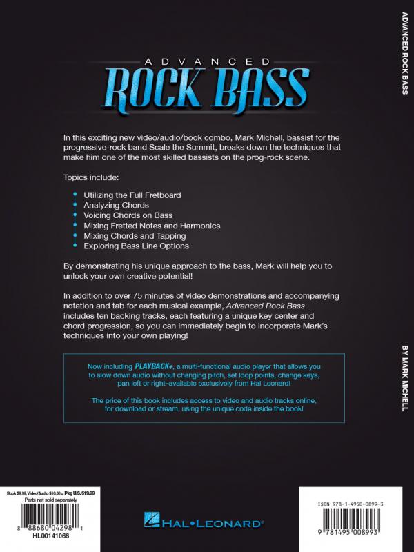 In this exciting new video/audio/book combo, Mark Michell, bassist for the progressive-rock band Scale the Summit, breaks down the techniques that make him one of the most skilled bassists on the prog-rock scene. Topics include: utilizing the full fretboard; analyzing chords; voicing chords on bass; mixing fretted notes and harmonics; mixing chords and tapping; exploring bass line options; and more! By demonstrating his unique approach to the bass, Mark will help you to unlock your own creative potential! In addition to comprehensive video demonstrations and accompanying notation and tab for each musical example, Advanced Rock Bass includes ten backing tracks, each featuring a unique key center and chord progression, so you can immediately begin to incorporate Mark's techniques into your own playing! The price of this book includes access to video and audio tracks online, for download or streaming, using the unique code inside the book. The audio tracks include PLAYBACK+, a multi-functional audio player that allows you to slow down audio without changing pitch, set loop points, change keys, pan left or right – available exclusively from Hal Leonard!
