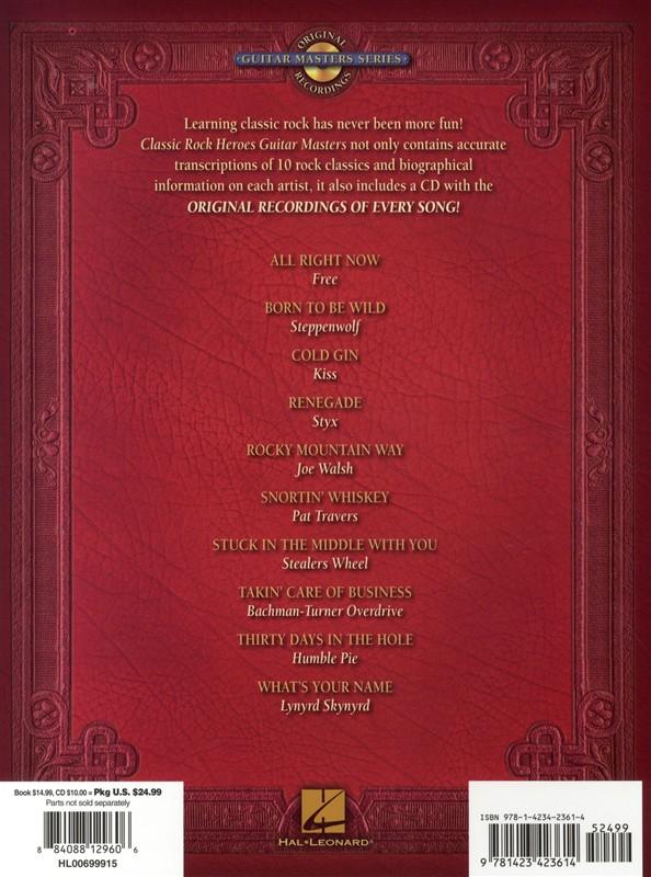 Classic Rock Heroes not only contains accurate guitar transcriptions of 10 classic rock anthems and biographical information on each artist, it also includes a CD with the ORIGINAL RECORDINGS OF EVERY SONG! Hear every note as played, every lyric as sung, and every bend as you remember – this is the real deal! Songs include: All Right Now - Born to Be Wild - Cold Gin - Renegade - Rocky Mountain Way - Snortin' Whiskey - Stuck in the Middle with You - Takin' Care of Business - Thirty Days in the Hole • What's Your Name. Also features great photos, detailed gear listings, and album info. 104 pages