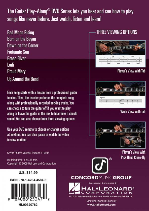 The Guitar Play-Along DVD Series lets you hear and see how to play songs like never before. Just watch, listen and learn! Each song starts with a lesson from a professional guitar teacher. Then, the teacher performs the complete song along with professionally recorded backing tracks. You can choose to turn the guitar off if you want to play along or leave the guitar in the mix to hear how it should sound. You can also choose from three viewing options: fret hand with tab, wide view with tab, pick & fret hands close-up. Each DVD includes great songs that all guitarists will want to know! Volume 20 includes: Bad Moon Rising - Born on the Bayou - Down on the Corner - Fortunate Son - Green River - Lodi - Proud Mary - Up Around the Bend. 96 minutes.