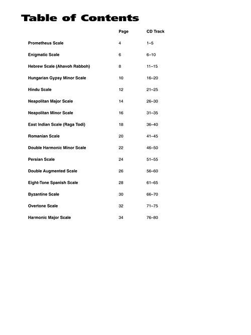 Expand your lead lines and scalar vocabulary with a whole book packed full of unusual scales and interesting ways to play them. The accompanying CD contains 80 demonstration tracks of all the licks in the book. Scales include: Prometheus, enigmatic, Hebrew, Hungarian Gypsy, Hindu, Neapolitan Major, Neapolitan Minor, East Indian, Romanian, double harmonic minor, Persian, double augmented, 8-Tone Spanish, Byzantine, overtone, harmonic major, and more. 40 pages