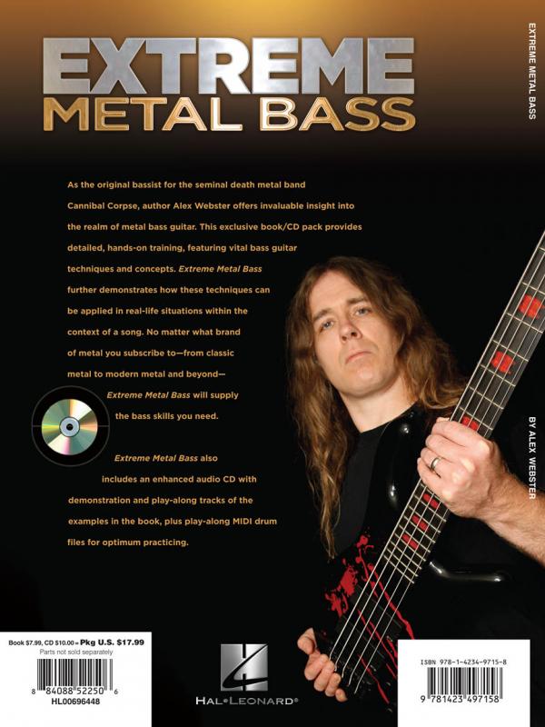As the original bassist for the seminal death metal band Cannibal Corpse, author Alex Webster offers invaluable insight into the realm of metal bass guitar. This exclusive book/CD pack provides detailed, hands-on training, featuring vital bass guitar techniques and concepts. Extreme Metal Bass further demonstrates how these techniques can be applied in real-life situations within the context of a song. No matter what brand of metal you subscribe to – from classic metal to modern metal and beyond – Extreme Metal Bass will supply the bass skills you crave. Extreme Metal Bass also includes an enhanced audio CD with demonstration and play-along tracks of all the examples in the book, plus play-along MIDI drum files for optimum practicing.