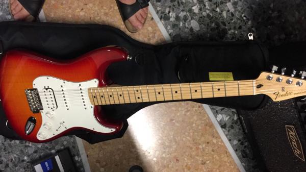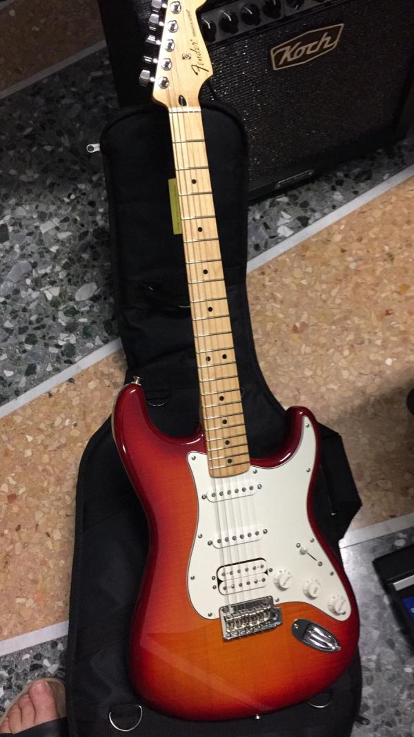 La Deluxe Stratocaster HSS Plus Top con connettività iOS consente di espandere le possibilità sonore della più grande chitarra elettrica al mondo collegandola direttamente ad un dispositivo iOS come iPhone, iPad, iPod o ad un computer senza la necessità di dispositivi esterni. Il segreto è l'interfaccia audio USB integrata nella chitarra. Si può sempre suonare come una standard Stratocaster HSS con un grande suono, ma l'uscita USB e l'uscita cuffie stereo 1/8" sul lato apre le porte a tutto un mondo di versatilità sonora e creatività. Utilizza il cavo USB mini B - Lighting in dotazione per collegare la chitarra direttamente all'iPhone, iPad o iPod, oppure il cavo USB mini B - USB tipo A per collegare direttamente il Mac o PC. E per completare il tutto, si tratta di una stupenda chitarra con un top in Acero fiammato ed una finitura Aged Cherry Burst lucida. Altre caratteristiche comprendono un manico in Acero con profilo "Modern C" e finitura lucida, tastiera in Acero con raggio di 9.5" e 21 tasti medium jumbo, pickup single-coil al manico e centrale, humbucking al ponte, selettore a 5 posizioni e tre manopole in plastica bianca (master volume, master tone, volume delle cuffie), battipenna a tre strati e ponte tremolo sincronizzato a due punti con sei sellette. Borsa imbottita inclusa.