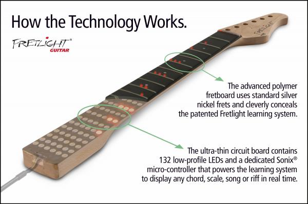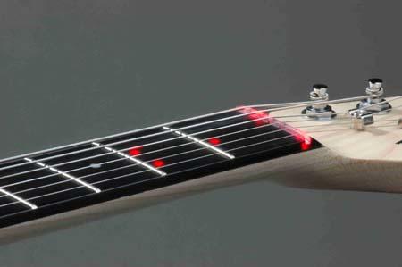 The Fretlight lighted guitar learning system allows a player to light-up songs, over five thousand chords and scales patterns, and riffs right on the neck of the Fretlight guitar. The Fretlight connects to a PC or Mac and there are lessons, songs and interactive videos available which all light up the guitar.