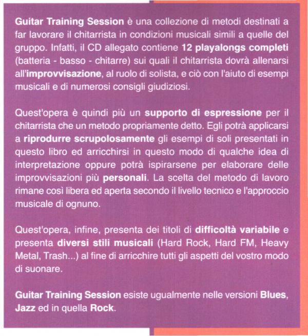 Guitar Training Session è una collezione di metodi destinati a far lavorare il chitarrista in condizioni musicali simili a quelle del gruppo. Infatti, il CD allegato contiene 12 play-back completi (batteria - basso - chitarre) sui quali il chitarrista dovrà allenarsi all'improvvisazione, al ruolo di solista, e ciò con l'aiuto di esempi musicali e di numerosi consigli giudiziosi. Quest'opera è quindi più un supporto di espressione per il chitarrista che un metodo propriamente detto. Egli potrà applicarsi a riprodurre scrupolosamente gli esempi di soli presentati in questo libro ed arricchirsi in questo modo di qualche idea di interpretazione oppure potrà ispirarsene per elaborare delle improvvisazioni più personali. La scelta del metodo di lavoro rimane così libera ed aperta secondo il livello tecnico e l'approccio musicale di ognuno.