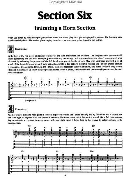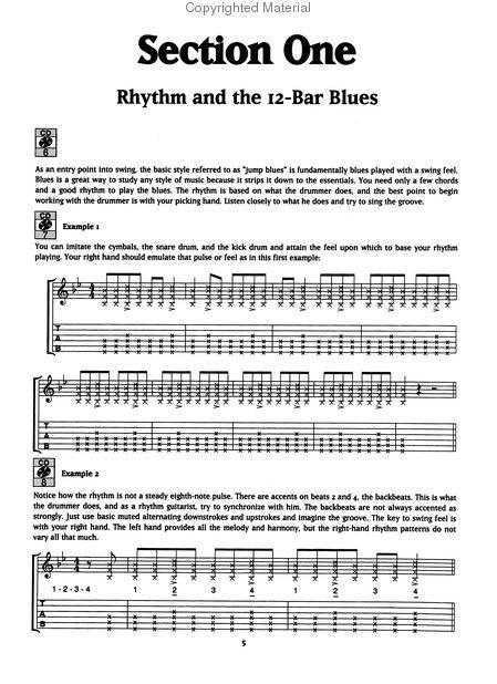The Swing Rhythm Section IOne of the first steps to playing swing guitar is having some knowledge of the construction of the rhythm section. The role of the rhythm guitarist is to work with the other musicians: support the soloist and the singer and complement the drummer, pianist, and bass player. Listen how each individual band member plays his part in a typical Iz-bar blues in this CDtrack example. The basis of the whole rhythm section lies in the kick drum, which plays on every beat. The pattern played on the cymbal typifies the swing style, and in big band arrangements, the snare drum can accent various parts of the rhythm or can emphasize the steady swing feel to drive the band. In jump blues, the snare pattern is a hard-hitting backbeat. This is the groove that gave birth to rock 'n' roll. The role of the bass is to outline the notes of each chord in the progression with a note on every beat. This is called a walking line. The piano typically plays a walking line in the left hand, as the bass does, and plays upbeats in the right hand synchronizing with the drummer and the bass player to emphasize the swing feel. Horn sections supply the color and variety in swing or jump blues arrangements. There are endless variations on patterns like the simple punchy riff demonstrated here. I Nowthat you have heard each instrument individually, listen to them all together as a band. Listen how each part comes in and complements one another as they build up the groove for the guitarist to step in.