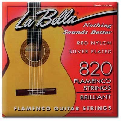 "The 820 Flamenco sets contain red nylon trebles and silver-plated wound basses. Especially designed for the flamenco player, this set produces extremely brilliant tones with only the slightes left hand finger pressure."