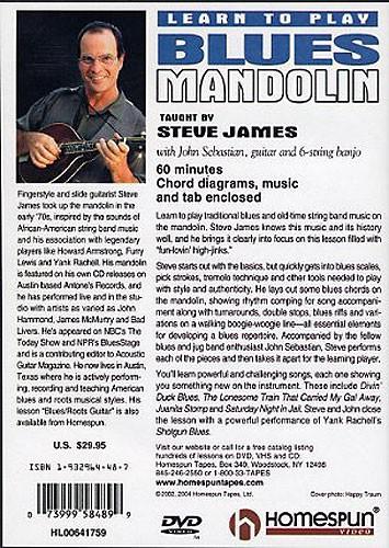 Steve James teaches the scales, chords, lead riffs, rhythm comping, turnarounds and other essential techniques for playing traditional blues and old-time string band music. A must for those who want to use the mandolin for rhythmic accompaniment or as a blues instrument. Songs include: Divin' Duck Blues -The Lonesome Train That Carried My Gal Away, more. 60-MIN. DVD INCLUDES CHORDS, DIAGRAMS, MUSIC + TAB BEGINNER LEVEL