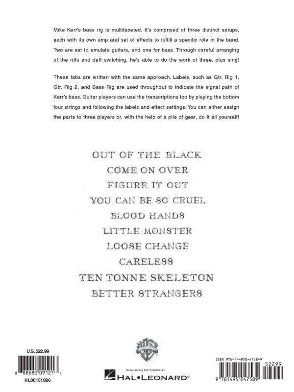 Matching folio to the debut release from this unique rock duo featuring just bass and drums. Includes note-for-note transcriptions of Mike Kerr's bass lines as well as lyrics. Songs include: Better Strangers • Blood Hands • Careless • Come on Over • Figure It Out • Little Monster • Loose Change • Out of the Black • Ten Tonne Skeleton • You Can Be So Cruel. Includes photos.