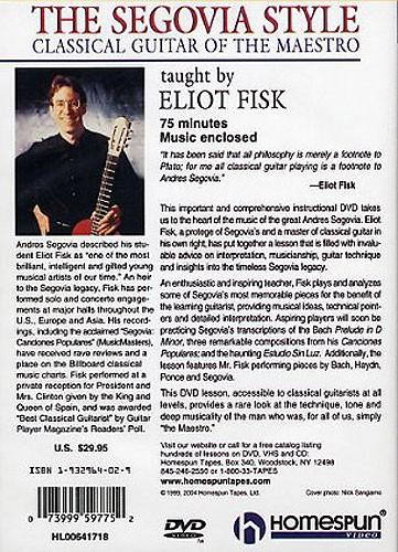 THE SEGOVIA STYLE, CLASSICAL GUITAR OF THE MAESTRO, ELIOT FISK. Booklet 23 pages (no TAB.) and DVD