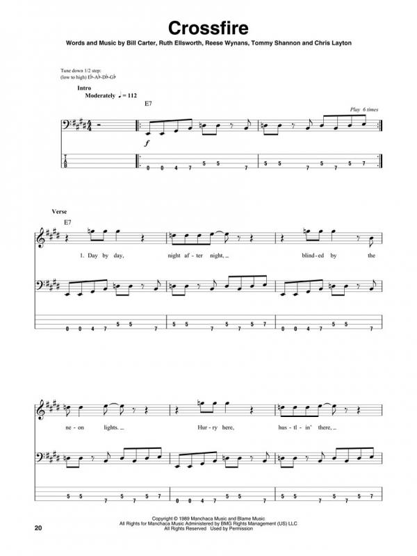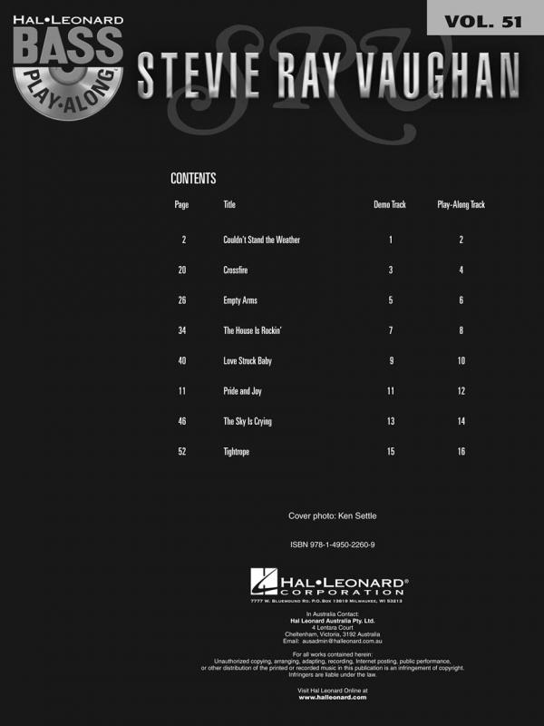 The Bass Play-Along series will help you play your favorite songs quickly and easily! Just follow the tab, listen to the CD to hear how the bass should sound, and then play along using the separate backing tracks. The melody and lyrics are included in the book in case you want to sing, or to simply help you follow along. The audio CD is playable on any CD player, and also enhanced so PC & Mac users can adjust the recording to any tempo without changing pitch! Songs: Couldn't Stand the Weather • Crossfire • Empty Arms • The House Is Rockin' • Love Struck Baby • Pride and Joy • The Sky Is Crying • Tightrope.
