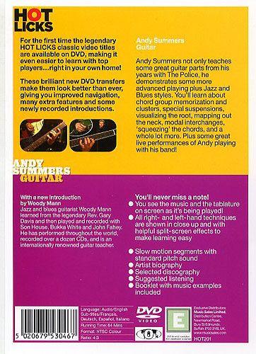 Andy Summers not only teaches some great guitar parts from his years with The Police, he demonstrates some more advanced playing plus jazz and blues styles. You'll learn about chord group memorization and clusters, special suspensions, visualizing the root, mapping out the neck, modal interchanges, queezing the chords, and a whole lot more. Plus some great live performances by Andy playing with his band!