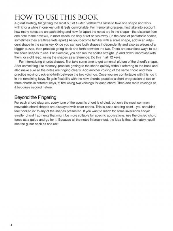 A great strategy for getting the most out of Guitar Fretboard Atlas is to take one shape and work with it for a while in one key until it feels comfortable. For memorizing scales, first take into account how many notes are on each string and how far apart the notes are in the shape—the distance from one note to the next will, in most cases, be only a fret or two away. (In the case of pentatonic scales, sometimes they are three frets apart.) As you become familiar with a scale shape, add in an adja-cent shape in the same key. Once you can see both shapes independently and also as pieces of a bigger puzzle, then practice going back and forth between the two. There are countless ways to put the scale shapes to use. For example, you can run the scales straight up and down, improvise with them, or sight read, using the shapes as a reference. Do this in all 12 keys. For internalizing chords shapes, first take some time to get a mental picture of the chord's shape. After committing it to memory, practice getting to the shape quickly without referring to the book and also make sure all the notes are ringing clearly. Add another voicing of the same chord and then practice moving back-and-forth between the two voicings. Once you are comfortable with this, do it in the remaining keys. To gain flexibility with the new chords, practice a short progression of two or three chords in different keys, at first using two voicings for each chord. Then add more voicings as it becomes second nature.