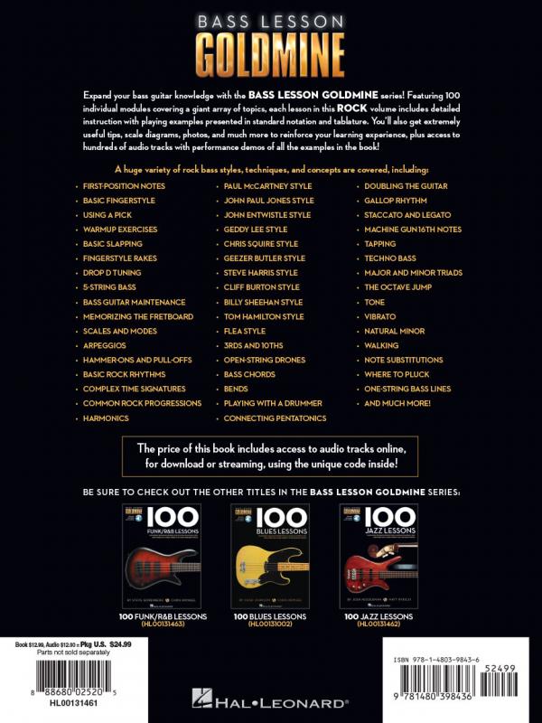 Expand your bass knowledge with the Bass Lesson Goldmine series! Featuring 100 individual modules covering a giant array of topics, each lesson in this Rock volume includes detailed instruction with playing examples presented in standard notation and tablature. You'll also get extremely useful tips, scale diagrams, chord grids, photos, and more to reinforce your learning experience plus 2 audio CDs featuring performance demos of all the examples in the book!