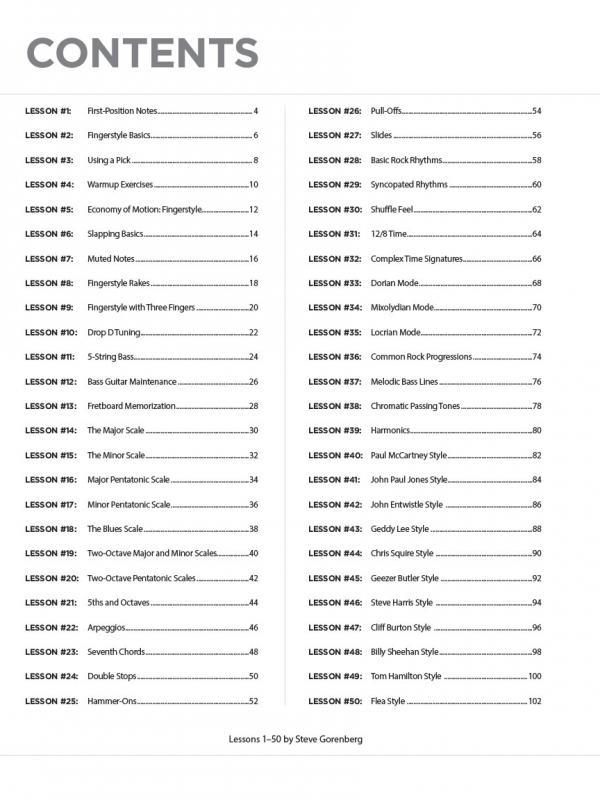This volume covers a huge variety of rock bass styles, techniques, and concepts are covered, including: first position notes; basic fingerstyle; basic slapping; fingerstyle rakes; drop D tuning; memorizing the fretboard; arpeggios; harmonics; Paul McCartney style; John Entwistle style; Geddy Lee style; Billy Sheehan style; Flea style; gallop rhythm; tapping; techno bass; walking; where to pluck; and much more!