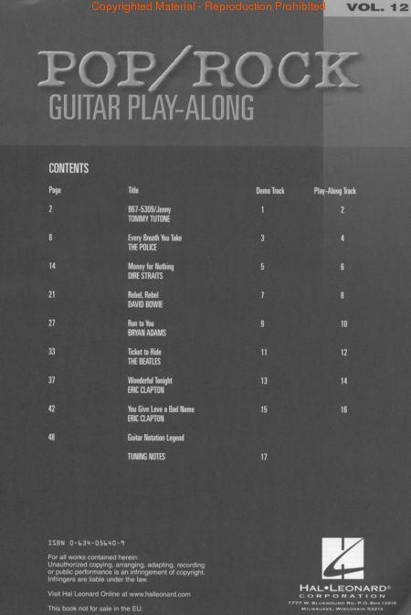POP/ROCK GUITAR PLAY-ALONG Vol. 12. 867-5309/Jenny -Every Breath You Take -Money for Nothing -Rebel, Rebel -Run to You -Ticket to Ride -Wonderful Tonight -You Give Love a Bad Name. CD TAB.