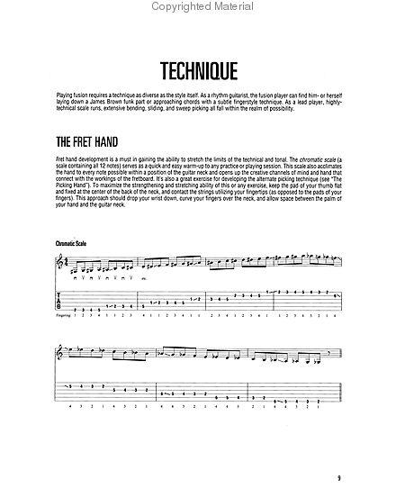 When you listen to the pioneering sounds of Miles Davis's Bitches Brew (1969) and ask yourself, "What is fusion?", only one thing can come to mind: a total exploration of the sonic experience. This is true for most jazz-rock fusion efforts of the late sixties and early seventies, the era in which it emerged as a recognized independent form of music. The era produced many architects of the fusion sound, including Tony Williams, Herbie Hancock, Chick Corea, Joe Zawinul, and guitar greats such as John McLaughlin and Larry Coryell. This period also saw the influence of jazz in rock, with groups such as the Byrds, Hendrix, Cream, the Greatful Dead, Frank Zappa, Blood Sweat and Tears, and Chicago experimenting in free-form improvisations and jazz tonalities. Regarding fusion, rock's contributions can be heard in its straight-eighth or sixteenth-note repetitive patterns and grooves. This is in contrast to traditional jazz-swing rhythms. Rock attributes also include certain tonal characteristics, such as power chords, classic rock/blues/funk phrasing, and a greater use of "guitar" techniques such as bending. The fusion sound was also heavily influenced by the use of electronic instruments and effects in sixties rock, such as distortion, delay, wah, and phasing. With expansive, and at times haunting, plays of harmony borrowed from the wider harmonic field of jazz, the improvisational character of jazz, and the drive and emotion of rock, fusion captured the emotional expression and conscious expansion sought by its early creators. Their music traveled from dreamy soundscapes to bursts of explosive energy with the ability to find a solid foundation in the consistent drive of an underlying rock or funk groove. This formula of early fusion reflected the explorative spirit of the sixties and remains a part of fusion today. However, it has also expanded into many facets, with artists gravitating towards greater or lesser sides of jazz or rock and their counterparts of funk, fusion, blues, and pop. Modern fusion guitarists include such players as Scott Henderson, John Scofield, Pat Metheny, and Allan Holdsworth, all of which lean to the more "hard-core" end of the experimental and exploratory side of fusion. Meanwhile, players such as Larry Carlton, Earl Klugh, and Lee Ritenour have found success in the pop culture of fusion music-what is known as the "smooth-jazz" sound. The influence of jazz-rock fusion does not end solely with those artists considered to be "fusion" artists. Mainstream rock and pop guitarists and musicians of every facet have found inspiration from the jazz and jazz-rock fusion sound. Consider the works of Sting, Carlos Santana, Dave Matthews, Nora Jones, and Joni Mitchell, to name only a few. Many fusion artists, especially those of the early sixties and seventies, drew artistic and personal inspiration from a desire for music to serve as a channel to greater mental and or spiritual consciousness. This concept can also be found in Eastern philosophies in which certain sounds and or rhythms open "spiritual" centers. Such influences are evident in the group names and album titles of the early fusion era as well. These concepts, and the inherent artistic drive of the jazz-rock fusion artist to branch out into a greater musical experience, have also introduced world and ethnic music forms into the fusion sound, including Latin, African, and Eastern music influences. As a melting pot of style and artistic personality, a mere attempt to define jazz-rock fusion might sound like: a spirit of limitless harmonic and melodic potential alive with the heart of groove.