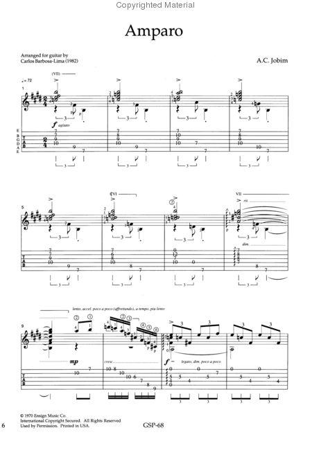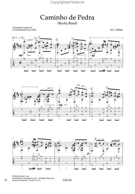 "Corcovado," "Stone Flower," "One Note Samba," plus six more Jobim masterworks, arranged for solo guitar with music notation and guitar tablature.