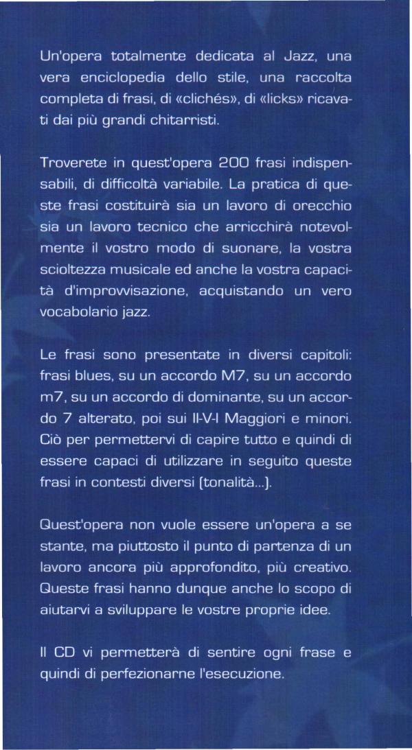 Un'opera totalmente dedicata al Jazz, una vera enciclopedia dello stile, una raccolta completa di frasi, di «clichés»,di «Iicks» ricavati dai più grandi chitarristi.