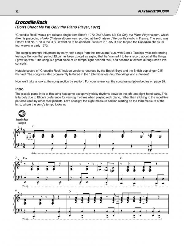 Study the trademark songs and signature phrases of the Rocket Man himself! This comprehensive book and audio teaching method provides detailed analysis of Elton John's grand pianos, techniques, styles, licks and much more. You'll learn everything you need to know about Elton's legnendary piano playing and find lists of recommended recordings and DVDs. It includes excerpts from 10 songs, plus five full songs: Don't Let the Sun Go Down on Me • Rocket Man • Crocodile Rock • Your Song • Sorry Seems to Be the Hardest Word.