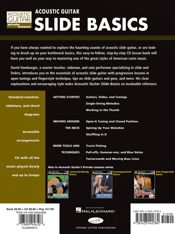 Bitten by the blues bug? If you have always wanted to explore the haunting sounds of acoustic slide guitar, or are looking to brush up on your bottleneck basics, this easy-to-follow, step-by-step CD lesson book will have you well on your way to mastering one of the great styles of American roots music. David Hamburger, a master teacher, sideman, and solo performer specializing in slide and Dobro, is uniquely qualified to offer you these nine progressive lessons on the fundamentals of acoustic slide guitar. 72 pages.