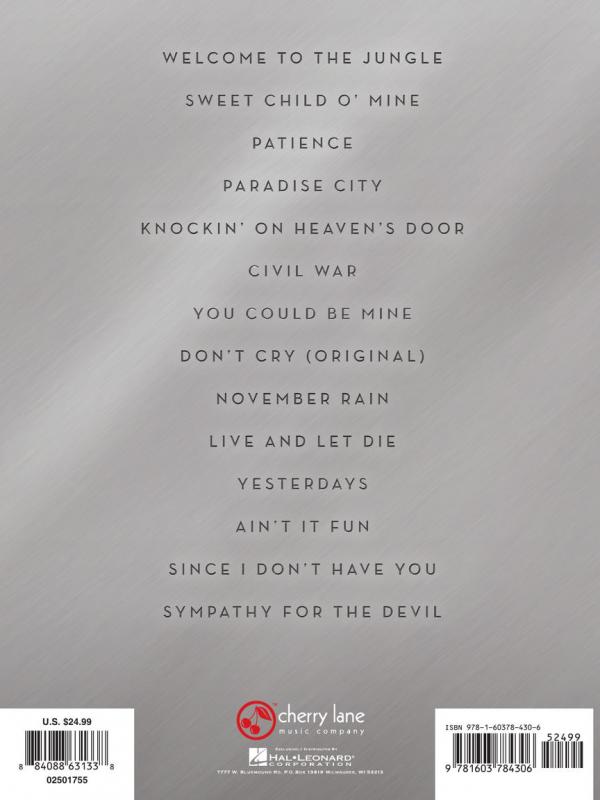 Spot-on transcriptions in notes & tab for 14 of the best from these Rock and Roll Hall of Famers: Don't Cry • Knockin' on Heaven's Door • Live and Let Die • November Rain • Paradise City • Patience • Sweet Child O' Mine • Sympathy for the Devil • Welcome to the Jungle • Yesterdays • and more.
